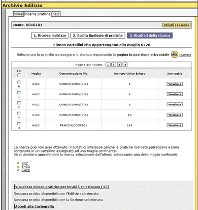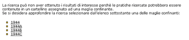 In caso di esito negativo della ricerca, il servizio offre la possibilità di ricercare i cartellini degli edifici appartenenti alle maglie aventi lo stesso numero ma lettera diversa selezionando una delle maglie proposte nell’elenco in fondo alla pagina: