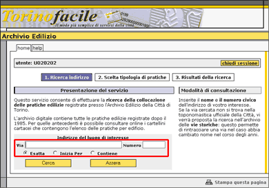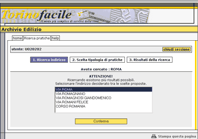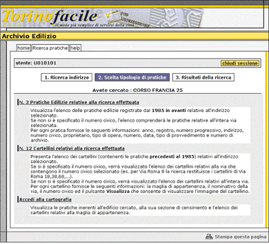 c. Il risultato è quindi la selezione della via d'interesse che consentirà di accedere alla pagina Scelta tipologia di pratiche da dove si possono compiere tre differenti operazioni: