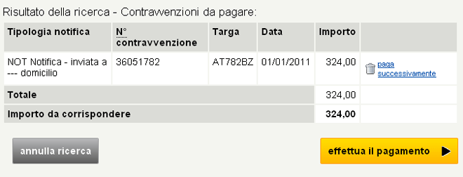 Se si intende eliminare una contravvenzione per pagarla successivamente cliccare su “paga successivamente”.