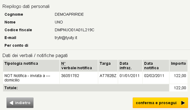 4. Confermare la richiesta di pagamento e i dati della contravvenzione selezionando “conferma e prosegui”.