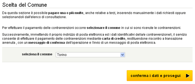 1. Scegliere il comune presso il quel è stata ricevuta la contravvenzione e premere “conferma i dati e prosegui”